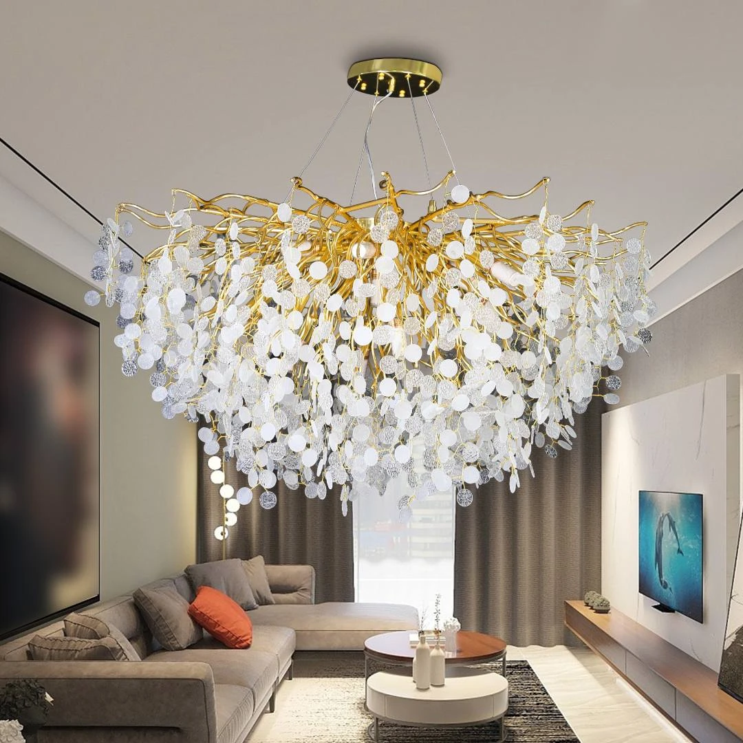 جمال مودرن أنيق يضيف بريقًا فاخرًا ولمسة معاصرة لأي غرفة. تصميم ذهبي مع قطع زجاجية شفافة ولمسات بيضاء يضفي توزانًا بين الفخامة والنعومة، مناسب لغرف المعيشة، غرفة الطعام أو الصالة الرئيسية.