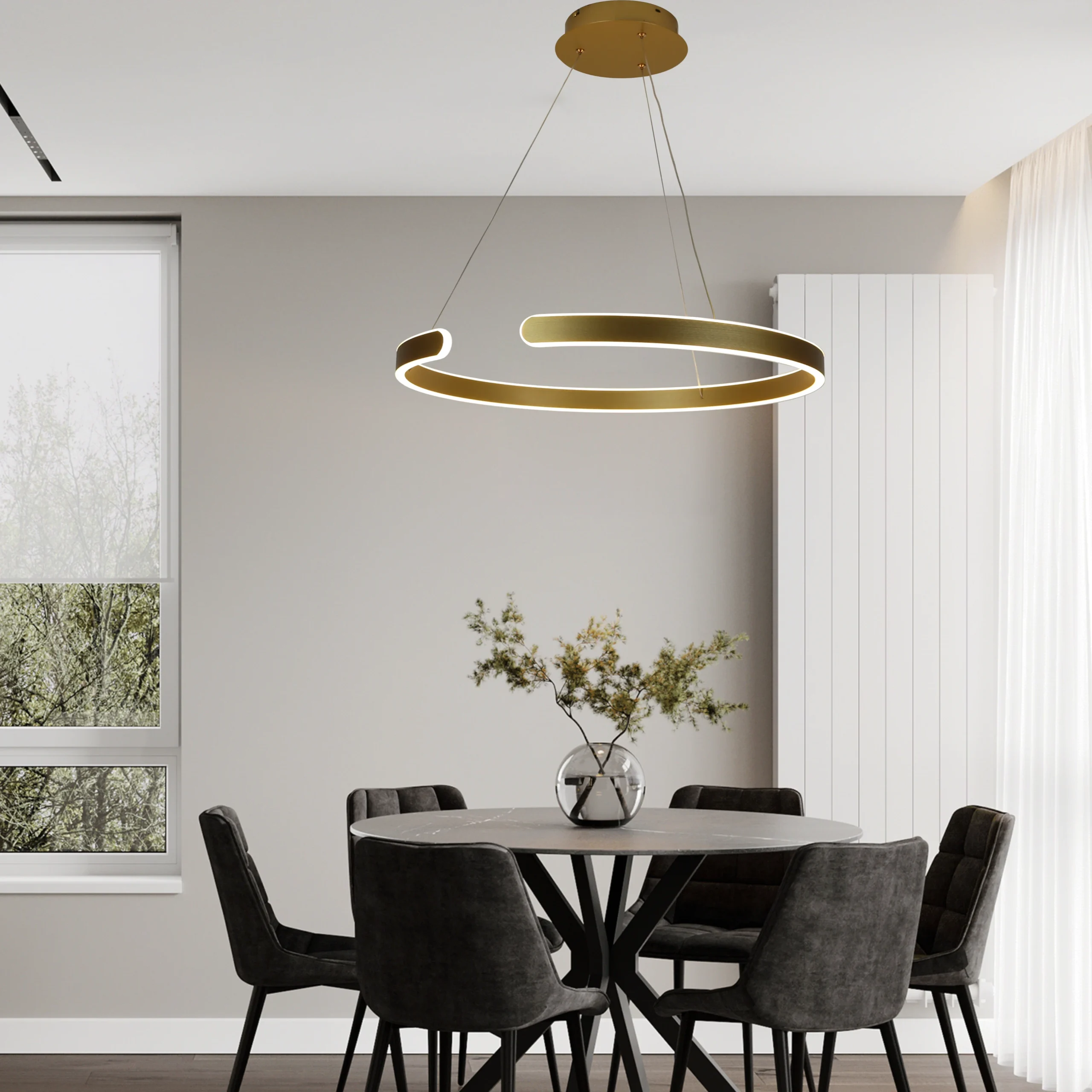 إضاءة مودرن أنيقة تمنح المكان طابعًا ناعمًا ومشرقًا. نجف ذهبي بتصميم معاصر مع إضاءة LED مدمجة، مثالي لإضفاء لمسة من الرقي على غرفة المعيشة، الصالون أو غرفة الطعام.