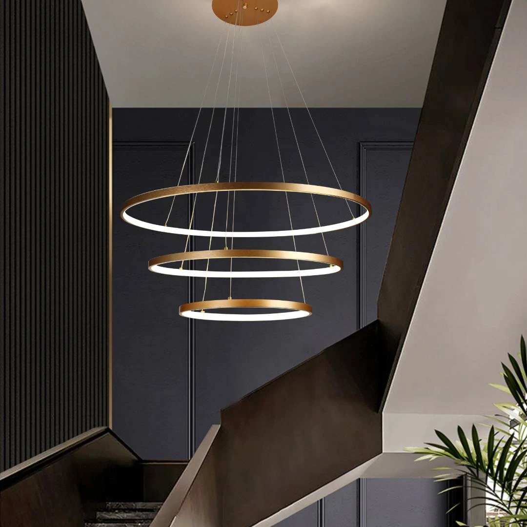ثريا مودرن بتصميم جذاب وتشطيب ذهبي فاخر تضيف لمسة من الأناقة والفخامة إلى أي مساحة داخلية. مثالية لصالات الجلوس، غرف الطعام أو الممرات، مع إمكانية تعديل الشكل والطول ليناسب احتياجاتك.