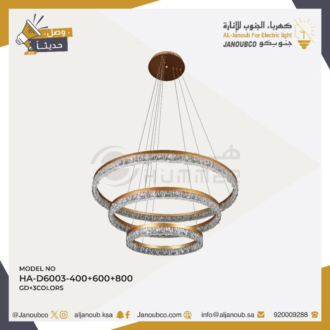 ثريا مودرن بأناقة ذهبيّة وتصميم معاصر يمنح المكان إطلالة فاخرة مع إضاءة LED قوية وقابلة للتعديل بحسب الحالة والمكان.