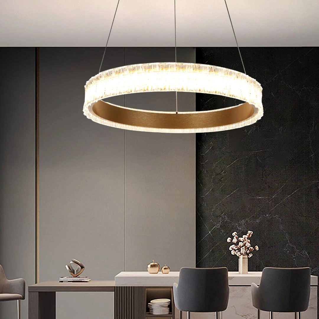 نجف بلون ذهبي عصري مع إضاءة LED ثلاثية الألوان تتيح لك اختيار جو الغرفة بين الإضاءة الدافئة، المحايدة أو الباردة. تصميم بسيط ومبهر يتناسب مع غرف المعيشة، غرف النوم، وغرف الطعام.