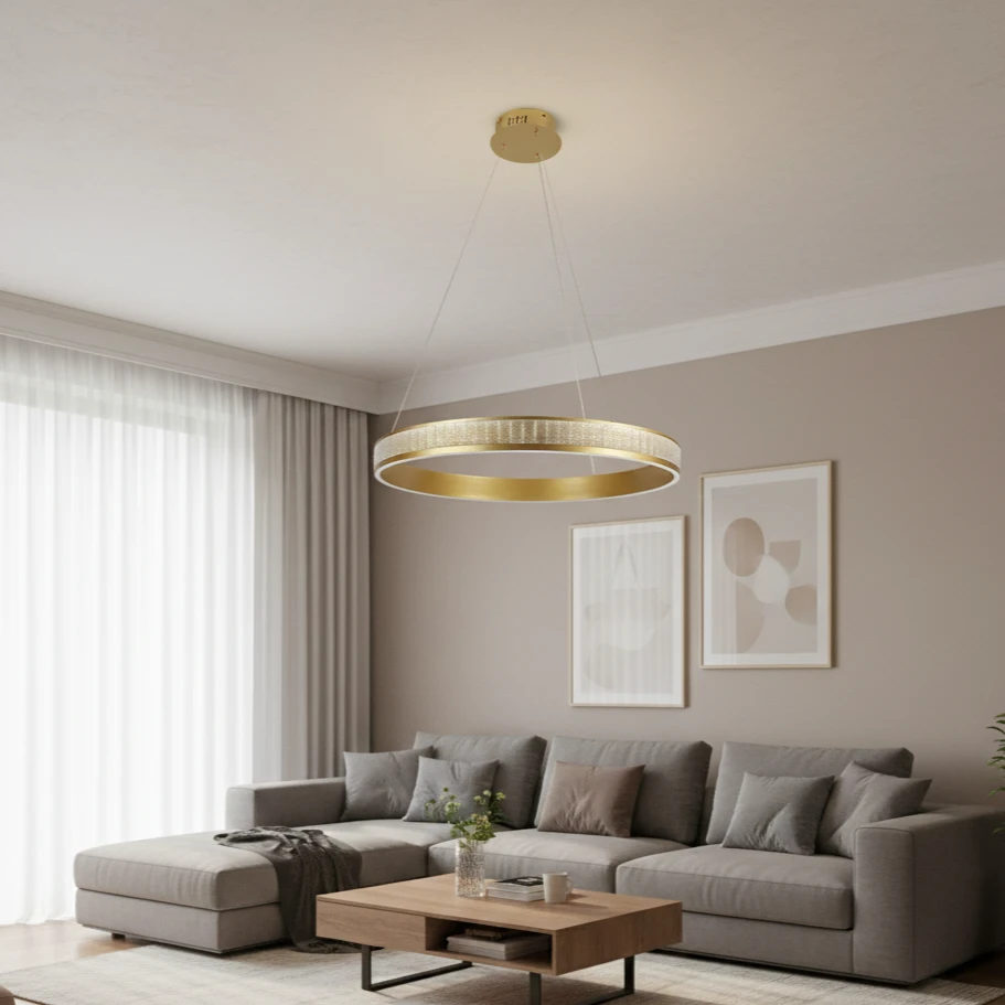 ثريا مودرن أنيقة تضفي طابعاً معمارياً ومعنقاً على أي مساحة داخلية. تصميمها الذهبي يمنح الغرفة لمسة فاخرة وعصرية، بينما تضمن الإضاءة المدمجة تقنية LED توفيراً في الطاقة وإضاءة متناسقة ومريحة للعين.
