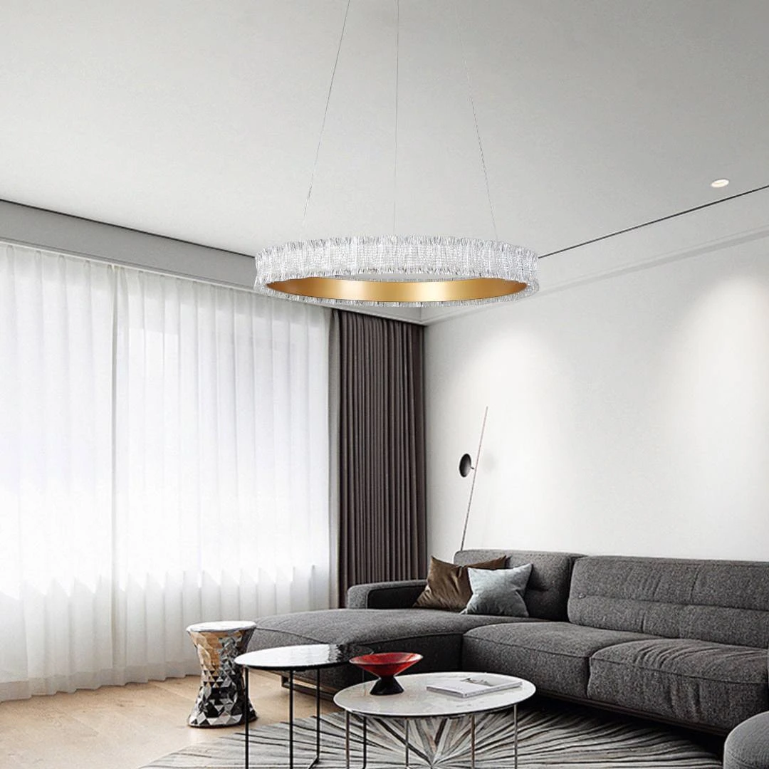 نجفة مودرن أنيقة بلمسة ذهبية تمنح غرفتك إضاءة راقية وأجواء فخمة قابلة للتعديل بثلاثة ألوان إضاءة مختلفة، جاهزة للاستخدام ومناسبة لغرف الجلوس، الصالون أو غرف الطعام.