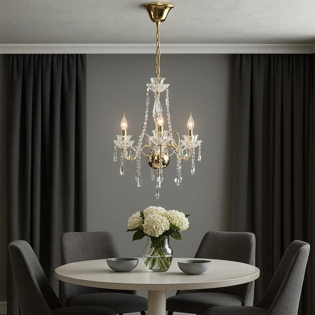 نجف مودرن أنيق بتشطيب ذهبي وفضي، مصمم على شكل شمعدان عصري ويوفر إضاءة موزعة ومتوازنة. يدعم ثلاث لمبات بحامل E14 ومناسب للاستخدام مع لمبات LED متعددة التحكم (قابلة للتعتيم أو التحكم عن بُعد حسب نوع اللمبات ونظام التحكم المستخدم).
