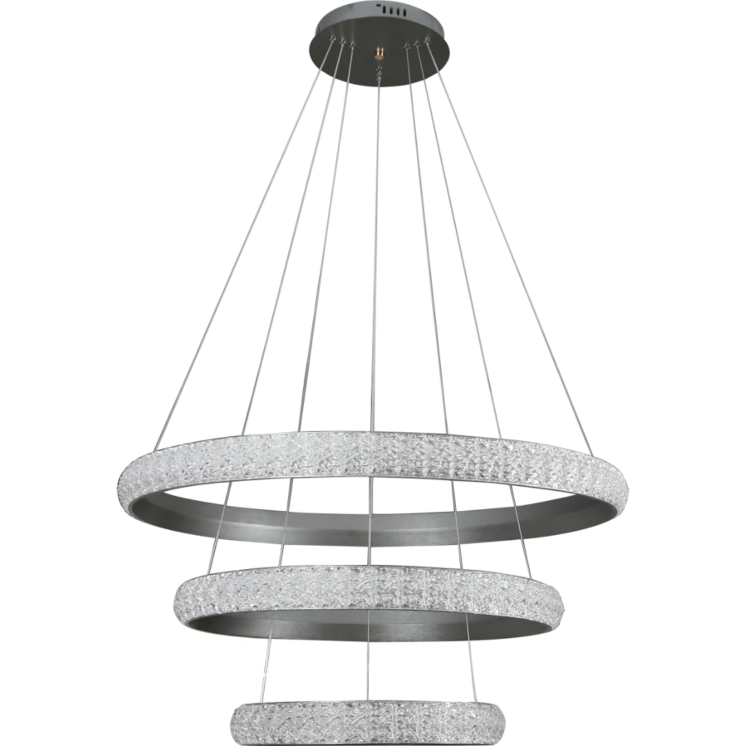 ثريا بتصميم حديث تتألف من ثلاث قطع بأحجام مختلفة (40 سم، 60 سم، 80 سم) لخلق تأثير بصري متدرج وجذاب. تشطيب فضي أنيق مع إضاءة LED أصفر دافئ توفر إضاءة ناعمة ومريحة للعين، مثالية لغرف المعيشة، السفرة، المداخل والمساحات المفتوحة.