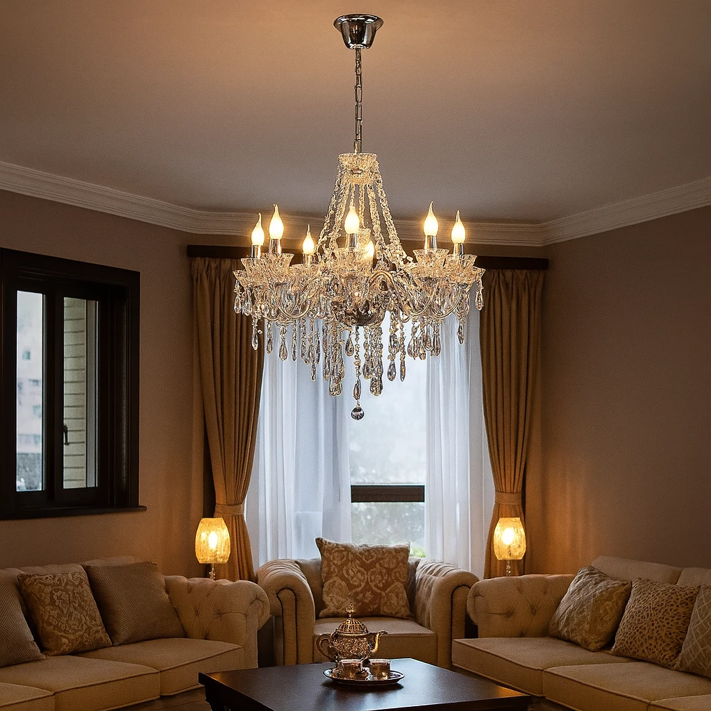إضاءة مودرن أنيقة تجمع بين البساطة والفخامة، مصممة بإطار فضي ولمسات زجاجية شفافة لإضاءة متوازنة ودافئة. مناسب لصالات المعيشة، غرفة الطعام والمداخل الفاخرة — يوفّر حضوراً مميزاً وقطعاً ديكورياً ملفتاً.