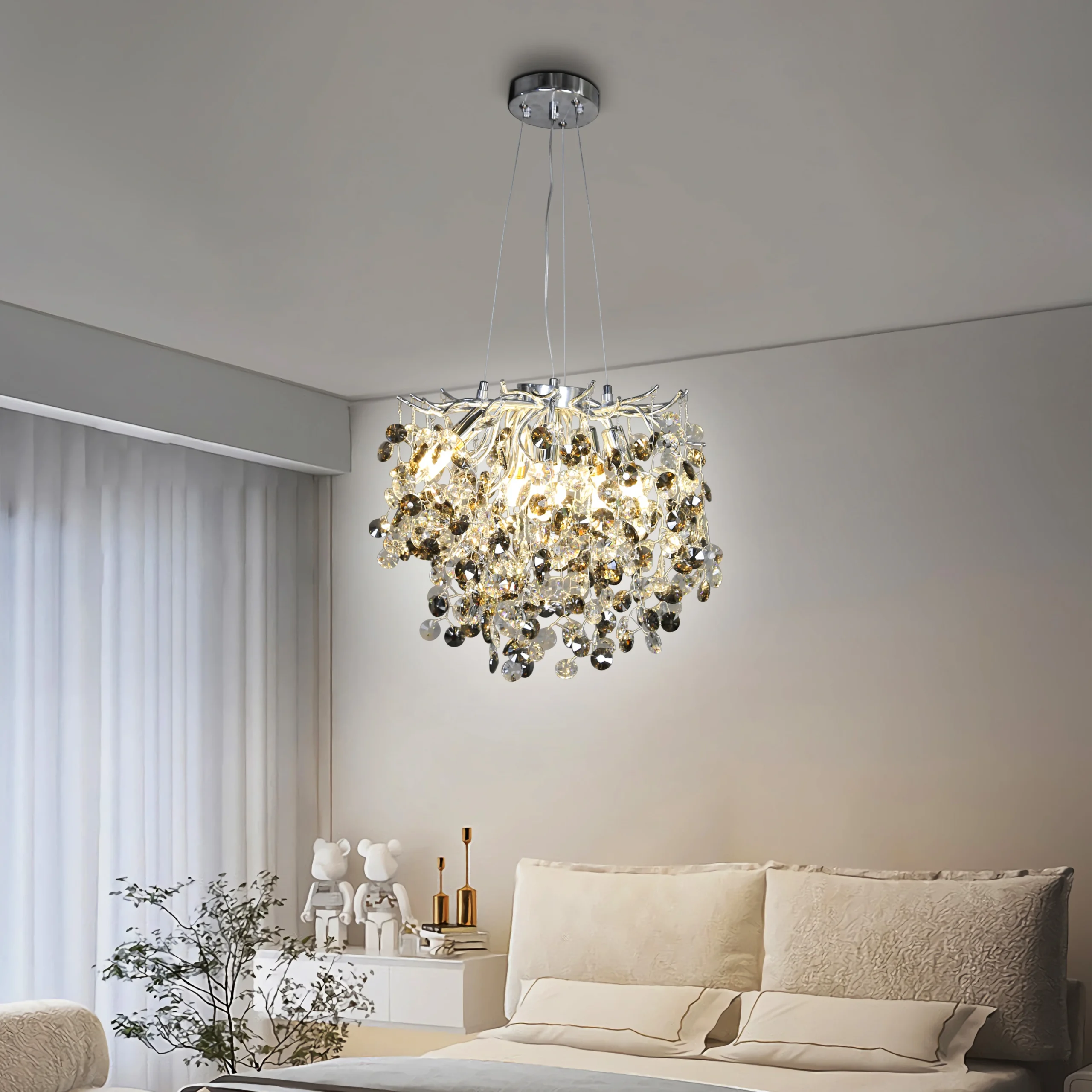 نجف مودرن فضي بشفاف ورمادي — E14 × 6 (قطر 45 سم)