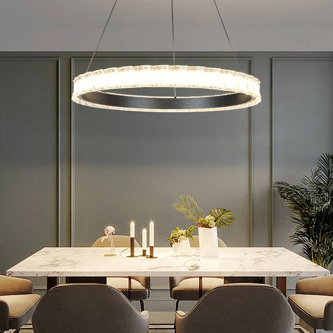 إنارة مودرن تمنح الغرفة مظهرًا متجدّدًا وتصميمًا أنيقًا يلفت الأنظار. نجف فضي بلمسة عصرية مع إضاءة LED ثلاثية الألوان التي تحيّي المكان وتوفر إضاءة مريحة وواضحة.
