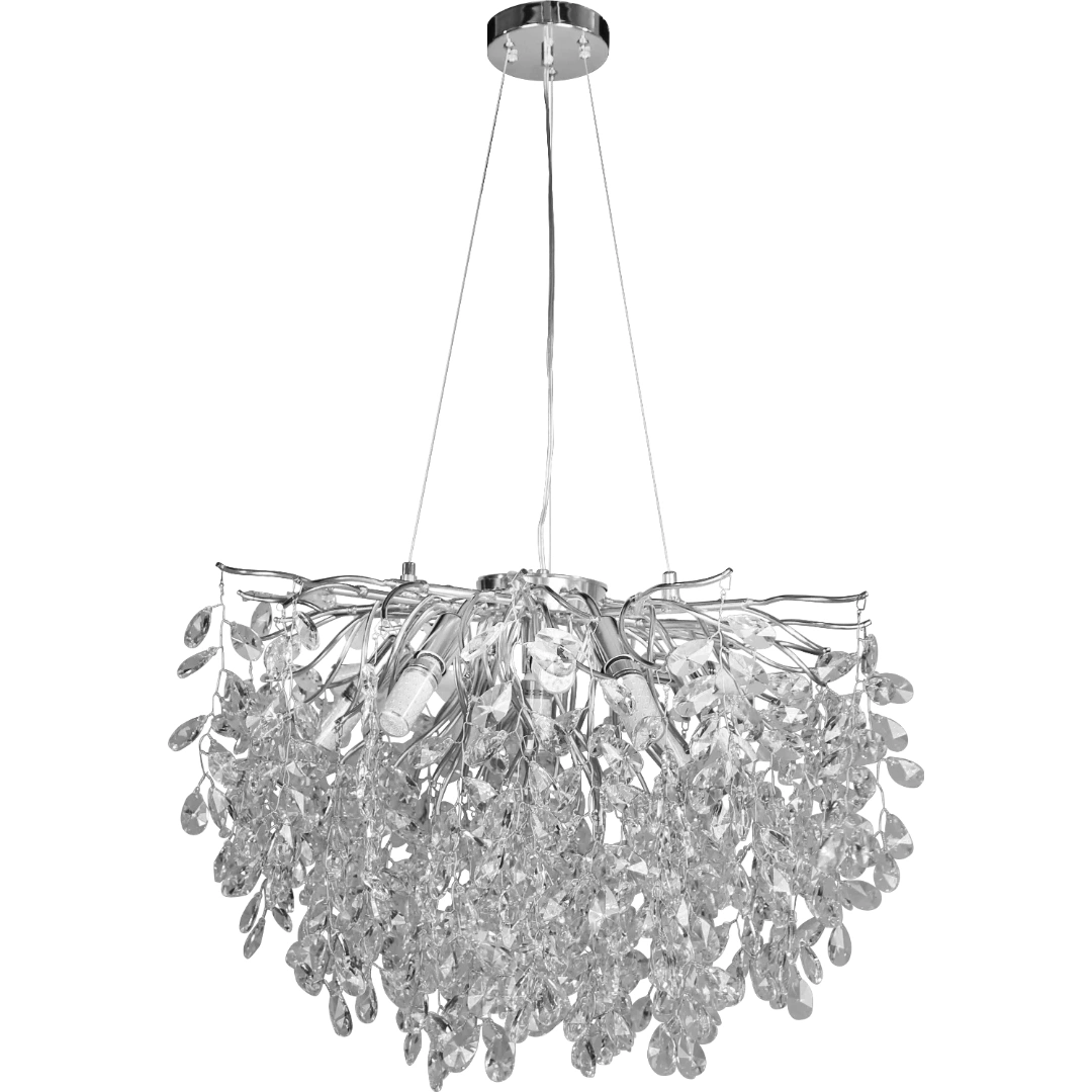 لمسة عصرية وأناقة لامعة لمساحاتك الداخلية — نجف مودرن بتصميم فضي مع عناصر زجاجية شفافة، مجهز لعشر لمبات بقواعد E14 ليمنح إضاءة متناسقة ومظهر فاخر لغرفة المعيشة، غرفة الطعام أو المدخل.