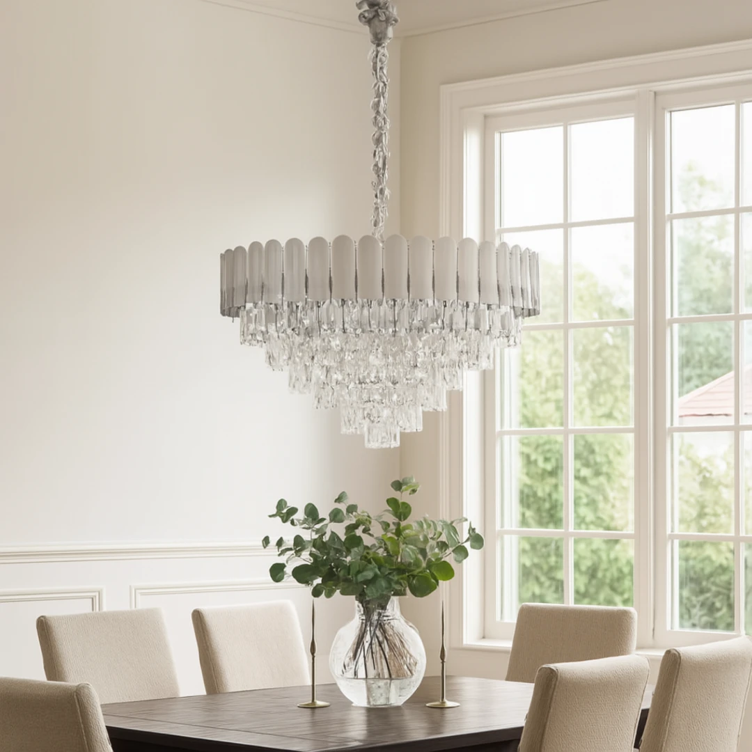 ثريا كريستال بتصميم أوروبي أنيق تناسب الديكورات الكلاسيكية والعصرية على حد سواء. تضفي لمسة فاخرة ورقي على غرفة المعيشة، صالة الاستقبال أو غرفة الطعام مع تشتت ضوئي ناعم ولمعان كريستالي مميز.