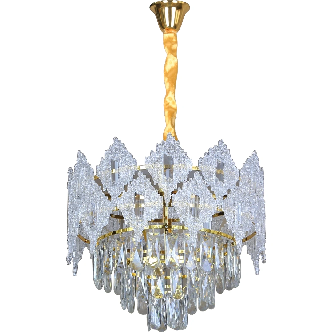 نمط مودرن أنيق يضفي لمسة فاخرة على منزلك بلمعان الكريستال وتشطيب ذهبي راقٍ. تصميم مدمج بحجم 40 سم مناسب لغرف المعيشة الصغيرة والمتوسطة، السفرة، أو الاستقبال.